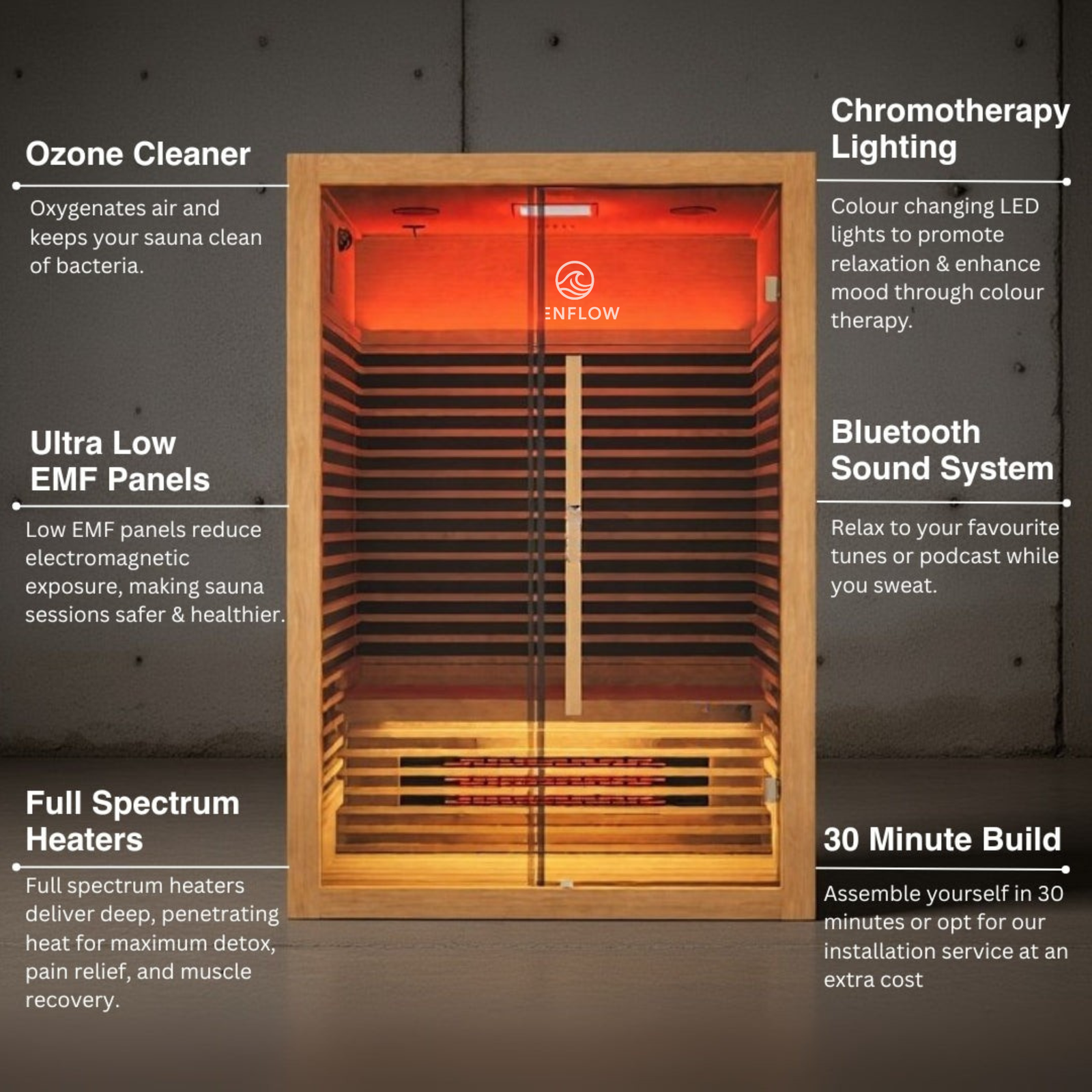 The combination of carbon and ceramic elements ensures even heat distribution, penetrating the body more effectively than traditional saunas for faster detoxification and improved circulation.